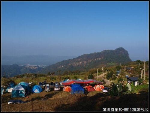 遠眺鷂婆山,橘色的天幕帳加上一堆橘色的帳棚就是我們的家