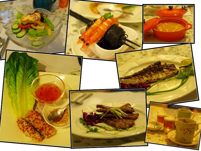 前菜是五彩的魚~不知道菜名耶~傻....把魚包沾醬包進羅蔓生菜再灑上花生碎粒,真的是外酥內軟~好吃